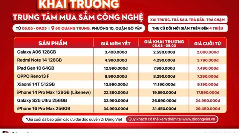 Trong hai ngày 08/3 – 09/3, trung tâm mua sắm công nghệ đầu tiên của hệ thống Di Động Việt sẽ diễn ra hoạt động khai trương và mở bán chính thức tại 60 Quang Trung, Gò Vấp, TP. HCM. Khách hàng đến tham quan trải nghiệm đều sẽ nhận quà miễn phí kèm nhiều ưu đãi hấp dẫn áp dụng cho tất cả các nhóm sản phẩm.
